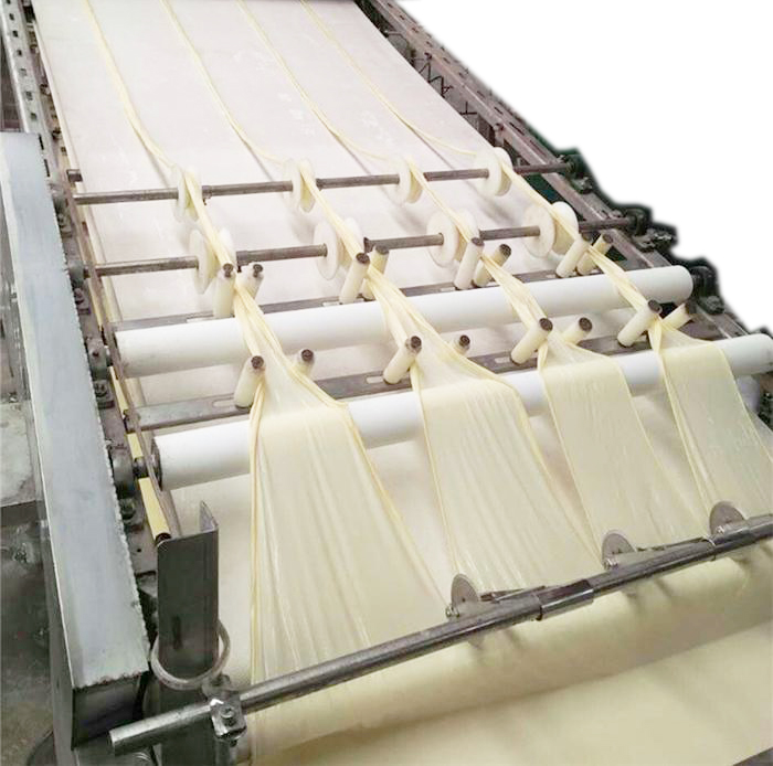 豆?jié){放入蒸發(fā)鍋后,經(jīng)保溫吹涼過程,將鍋表面結(jié)皮的產(chǎn)品送入輸送帶,自動(dòng)卷起、烘干一體機(jī),如此反復(fù),至將